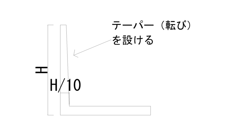 もし天端厚に制約がある場合は、擁壁背面にテーパー(転び)を設け、竪壁のつけ根部分でH÷10の厚みを確保するようにしましょう。